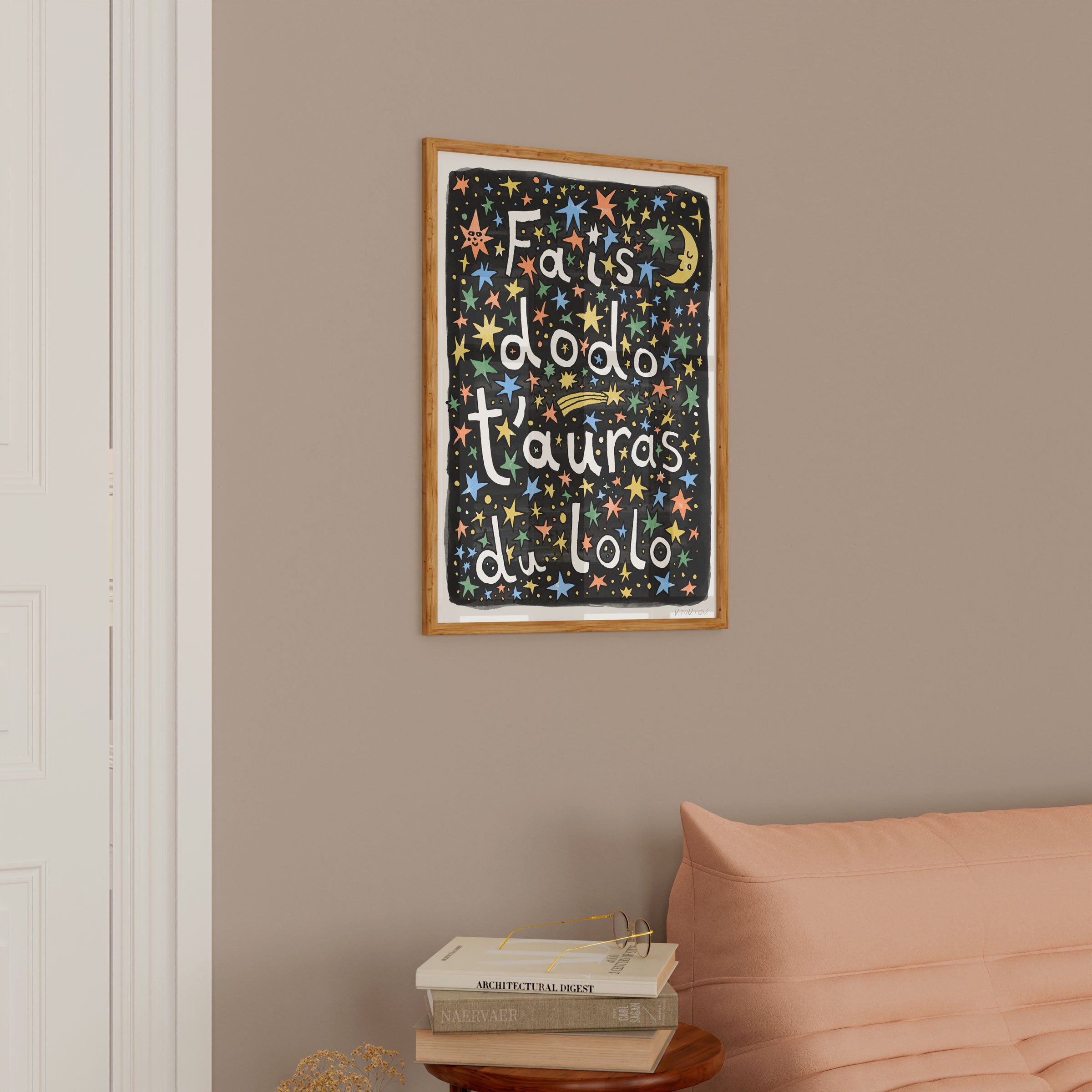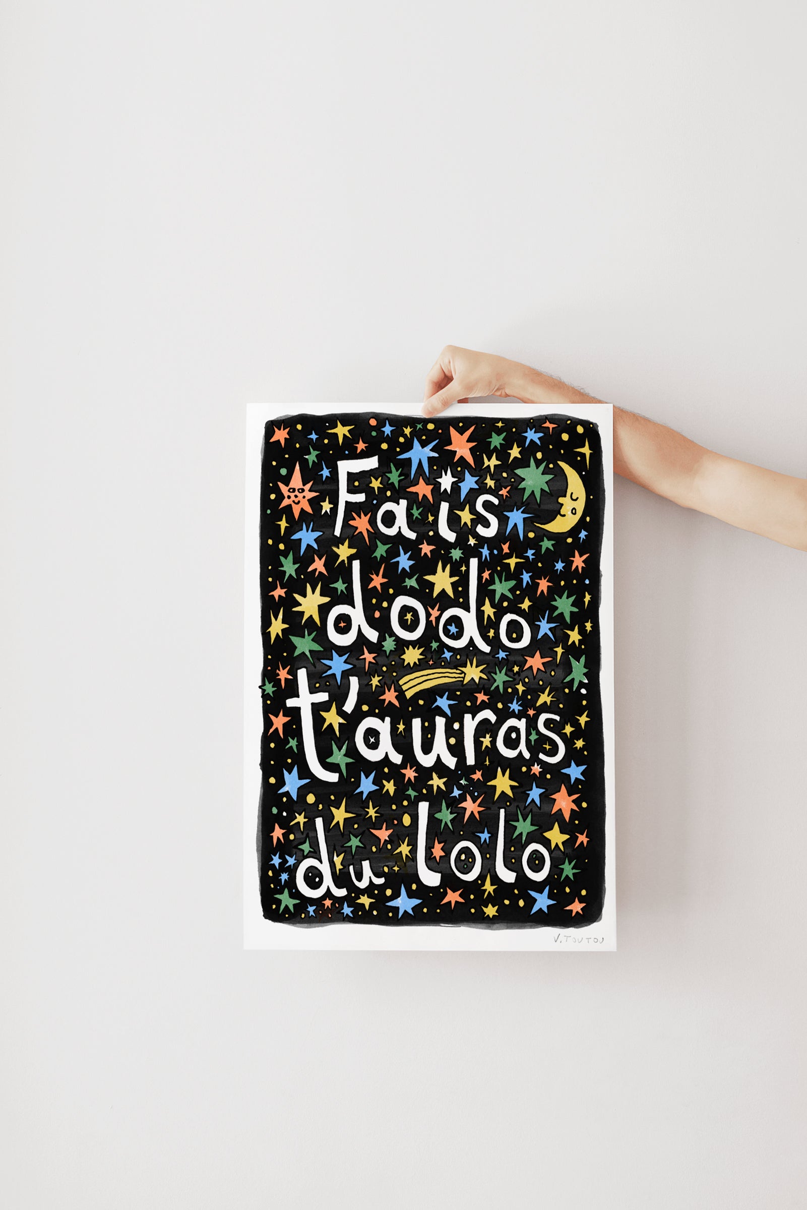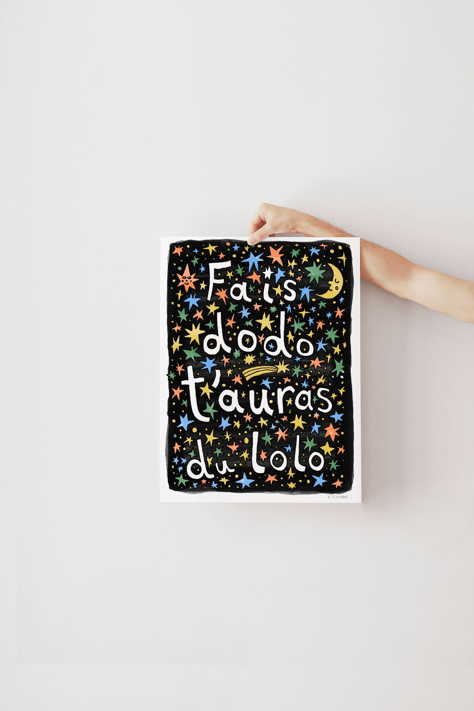 (French) Fais dodo t'auras du lolo: A cute illustration perfect for a child's room! High-quality giclee print of a work by Quebec illustrator Vincent Tourigny.