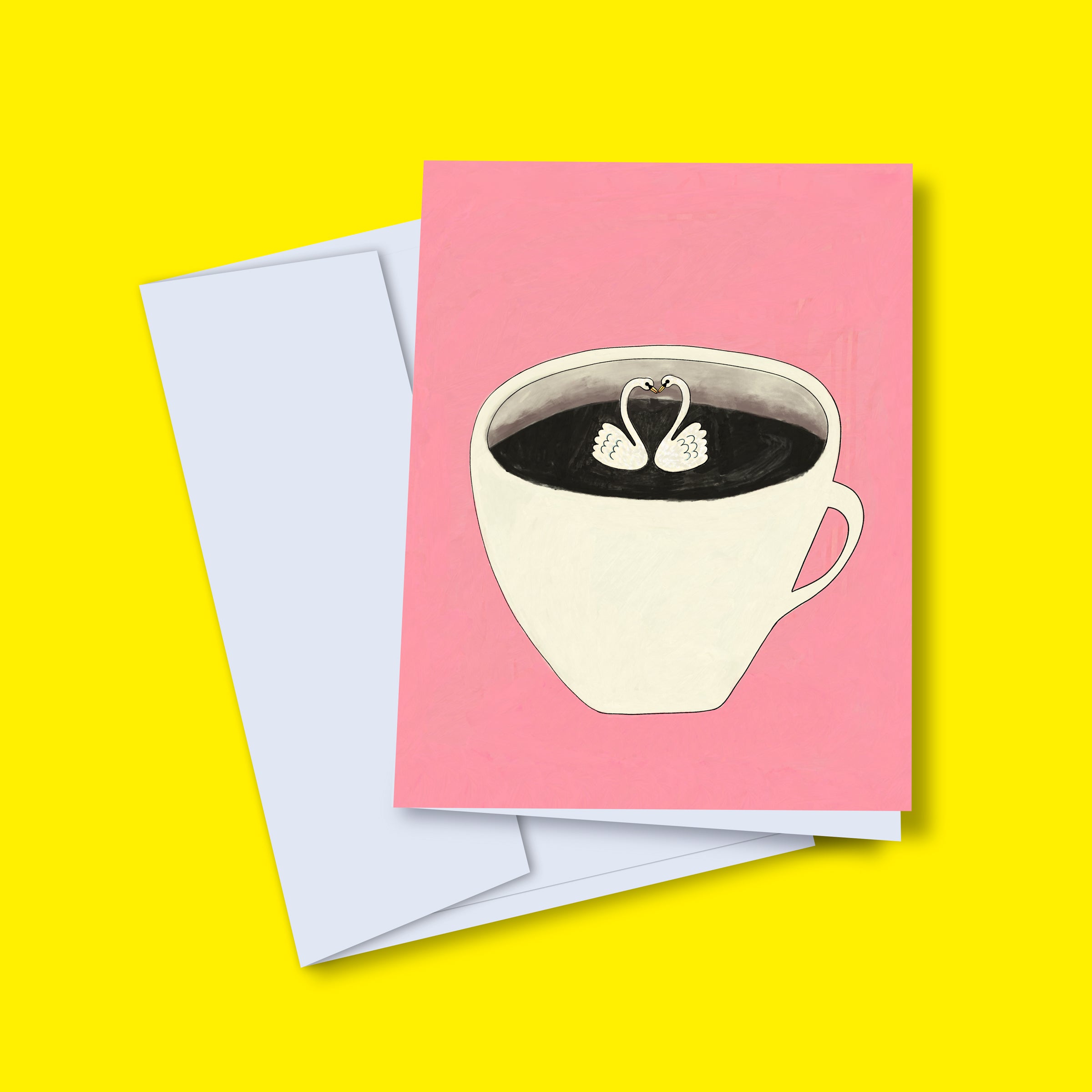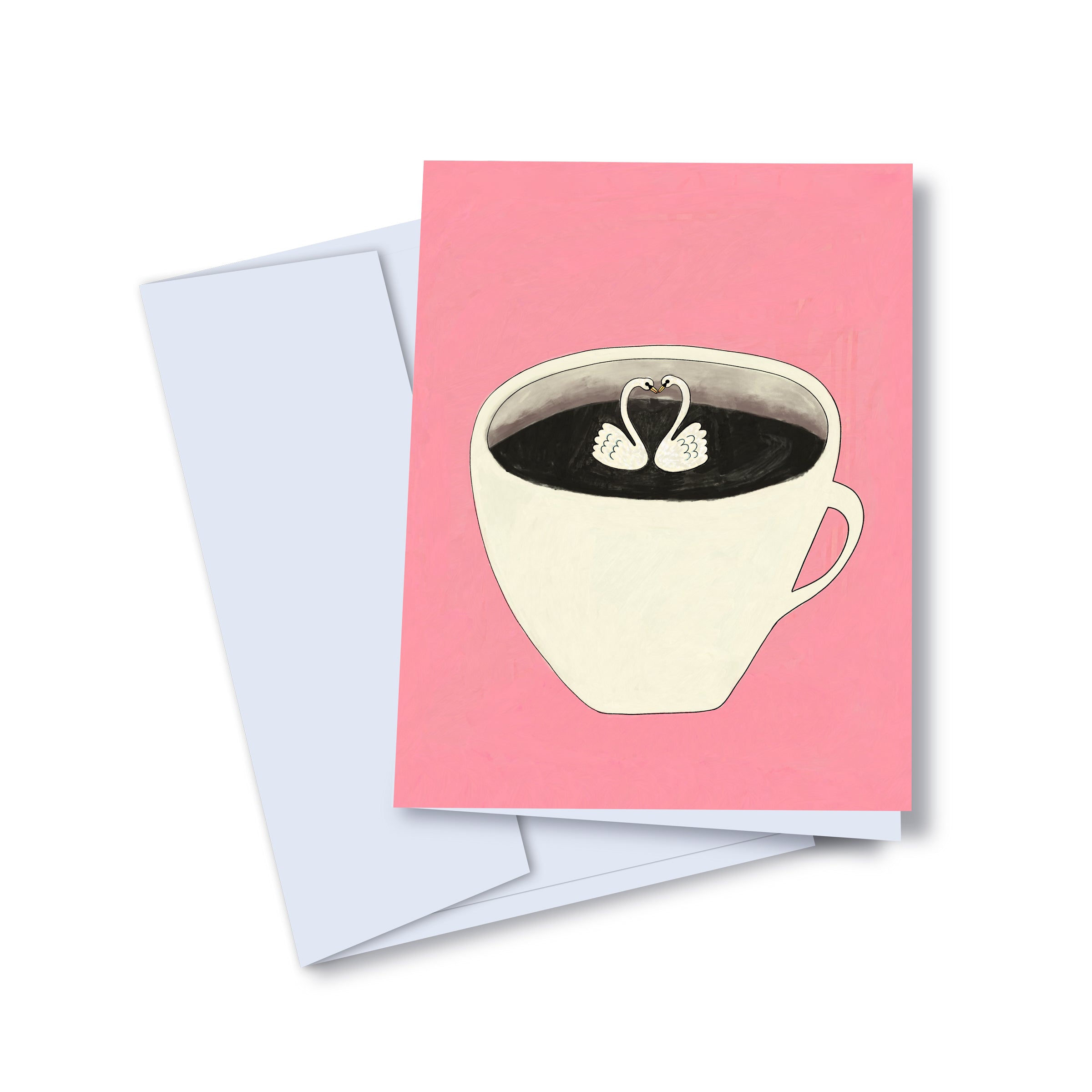 Carte de souhait originale pour la Saint-Valentin illustrant deux cygnes dans une tasse à café! Cette carte de souhait est imprimée à Montréal et illustrée par l'illustrateur québécois Vincent Tourigny.
